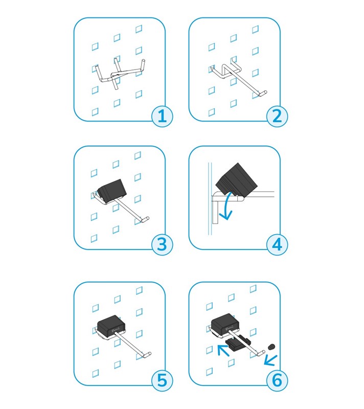 Il gancio The Block per pannelli a foro quadro è un gancio portautensili con l’aggiunta di un blocco per l’anti ribaltamento. Una volta inserito il gancio, viene installato il pratico blocco di sicurezza che ferma il supporto e ne evita il movimento nelle operazioni di inserimento ed estrazione dei diversi attrezzi e oggetti.